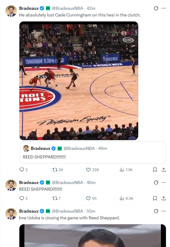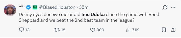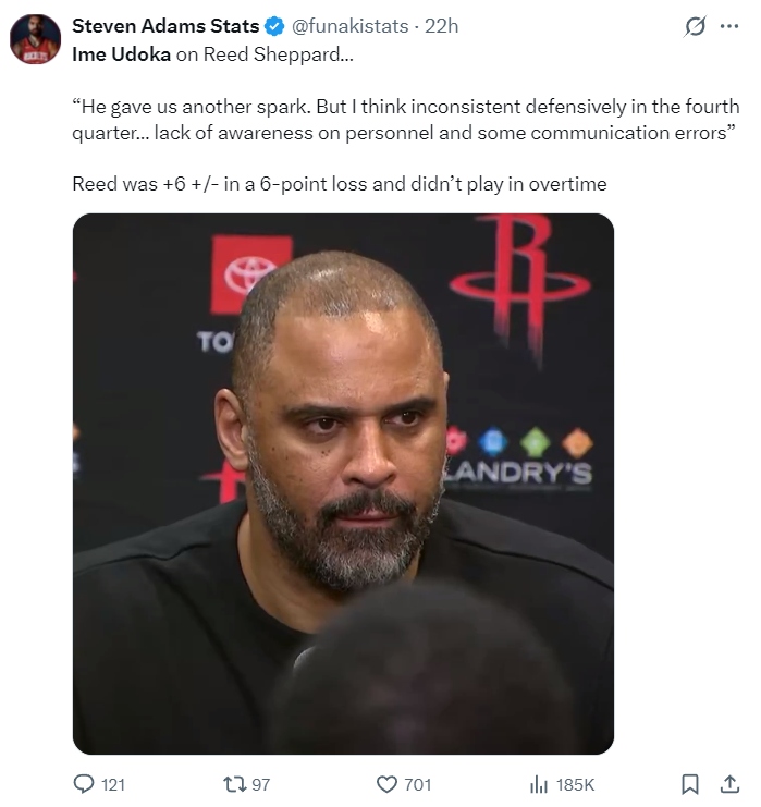 火箭记者还感谢乌度卡给了谢泼德在末节决胜时刻的机会,谢泼德与杜兰特的这个挡拆攻框非常精彩,谢泼德是有阅读比赛能力的球员。