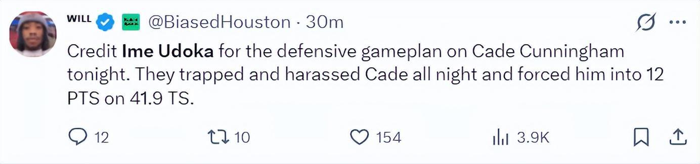 休媒:今晚对坎宁安的防守策略要归功于乌度卡,球队整晚都在对CC进行包夹、紧逼防守,这让他只拿到12分,命中率仅41.9%。
